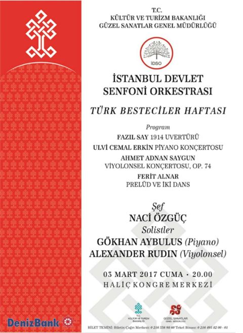 İDSO Denizbank Konserleri’nde 3 Mart Cuma günü yine klasik müzik dolu bir akşam yaşayacak. Fazıl Say, Ulvi Cemal Erkin, Ahmet Adnan Saygun, Ferin Alnar eserleri icra edilecek.