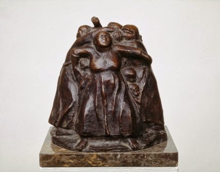 Kollwitz aynı zamanda bronz ve taş malzemeleriyle çalışan bir heykeltıraştır da. 1910’da başladığı heykel çalışmalarında da, resimlerinde işlediği konuları ele almıştır. Kollwitz, çocuklarını kaybetmekten de çok korkar ve sanatçının eserlerinde bu korkusunun etkilerini de görürüz. Anne ve çocuk temasını çokça işlemiştir. Özellikle savaşta 18 yaşındaki oğlunu kaybetmesinden sonra, resimlerinde daha çok ölü çocuk teması, çocuklarına sarılmış anne figürleri yapmaya başlar. Bu şekilde anneler çocuklarını tüm kötülüklerden korusun istemiştir. Oğlunun ve oğlu gibi yüzbinlerce gencin acısını yıllarca üzerinde çalıştığı yaslı anne ve baba heykellerinde dile getirmiştir. Bu iki heykel şu an Belçika’da, Flandre’daki meçhul asker mezarlığının kapısındadır.