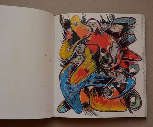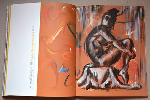 Dönüştürülen kitap çalışmalarıma sanatçılara ait katalogları da dahil ettim. Bunların içinde bir kolleksiyoncunun kataloğundaki basılmış resimleri başka bir şeye çevirdim. Katalogdaki resimler kendi kompozisyonumun alt yapısını oluşturdu. Zemindeki renkleri ve şekilleri kendi formlarıma destek olarak kullandım. Sonuçta aşağıdaki çalışma gibi birçok resim gerçekleştirdim.